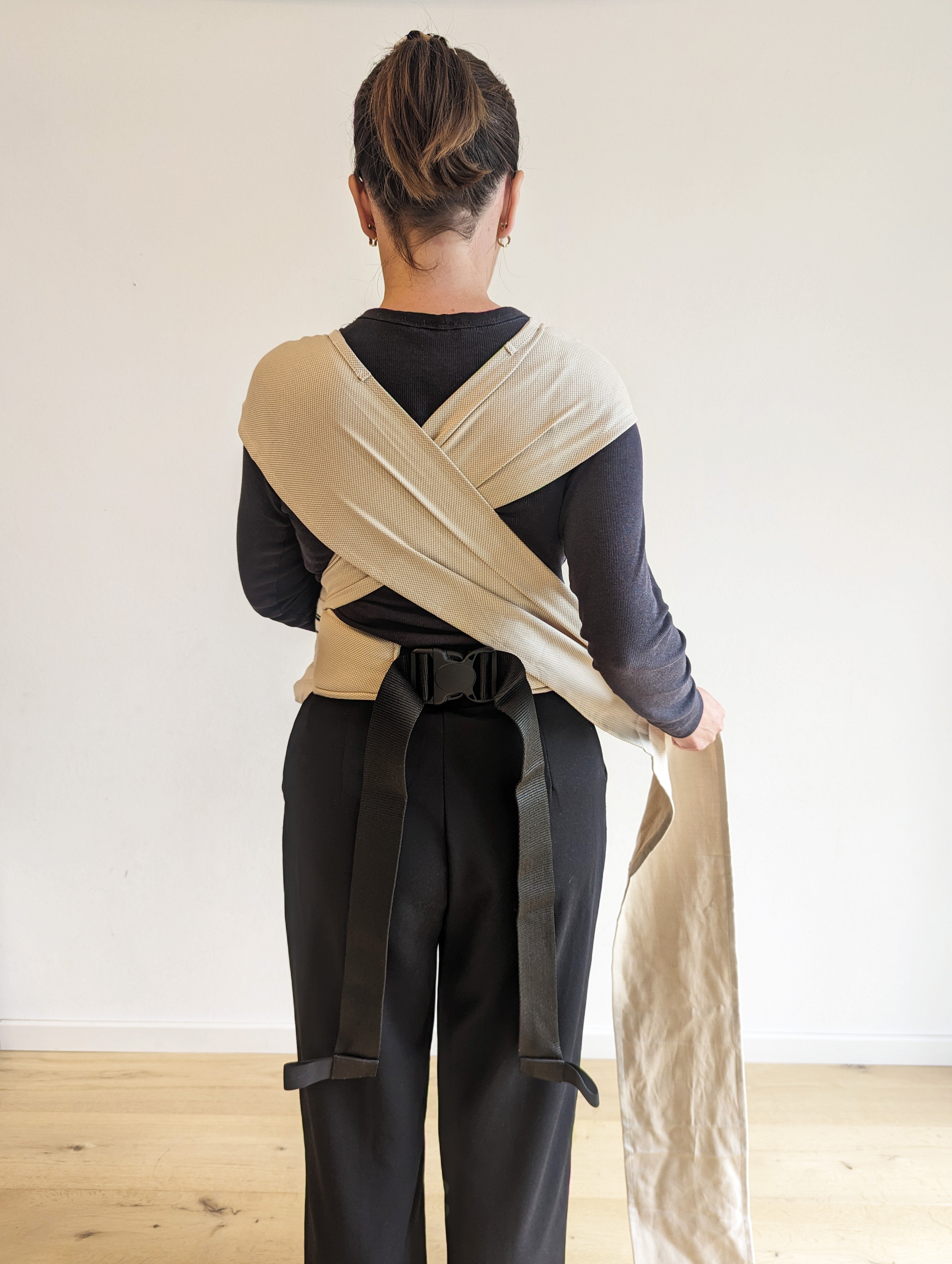 Pull the shoulder strap back towards you in a criss-cross pattern. Pass it under your baby's feet and hold it in front.