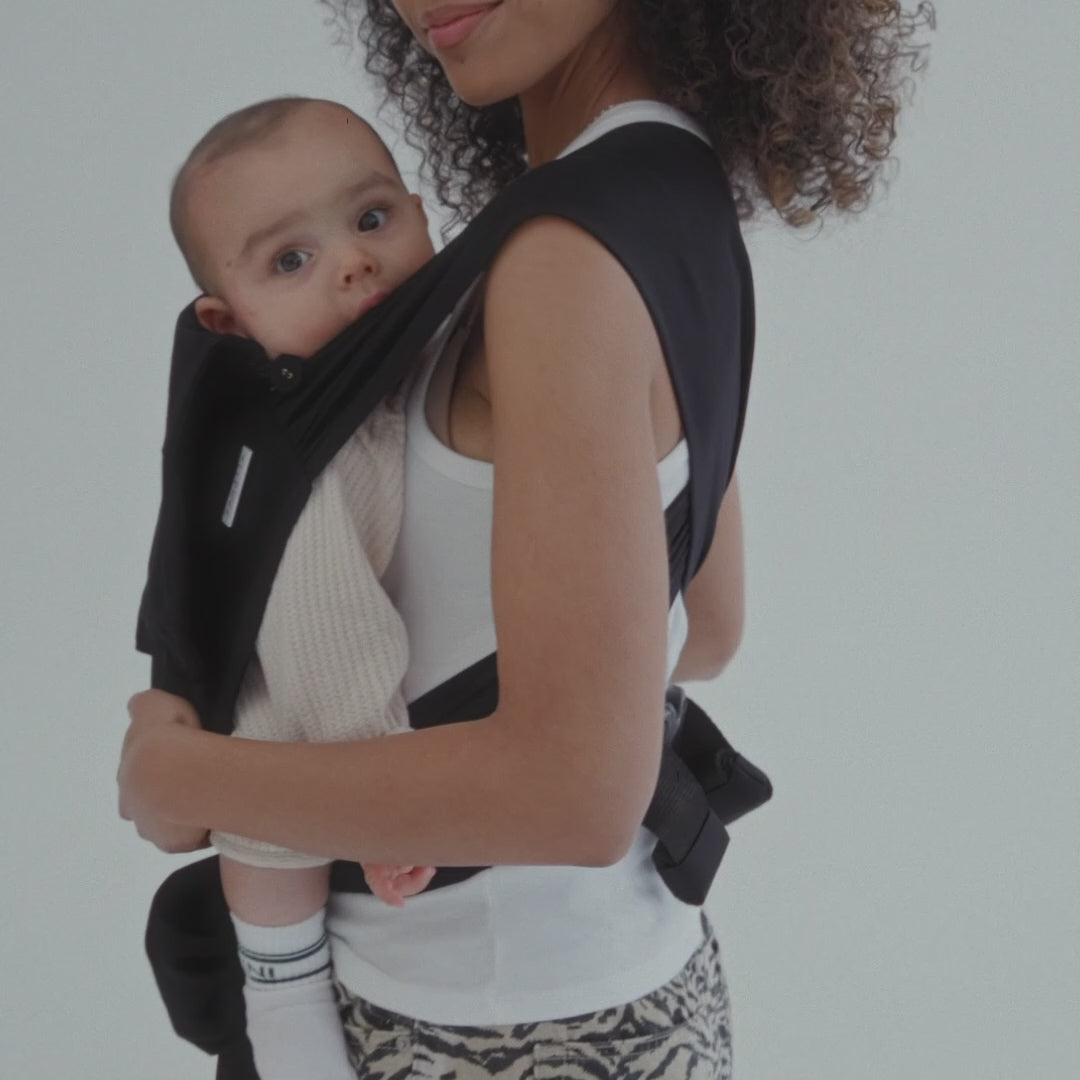 Your baby sits in the baby carrier with their stomach facing you. Your baby should never sit facing forward in the baby carrier if you wear the carrier on your stomach, as this can be harmful to your child's hips. This prevents your baby's back from rounding. Furthermore, your baby may suffer from sensory overload because they cannot turn their head away.