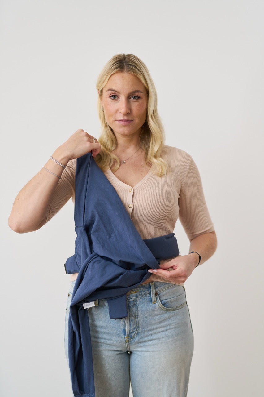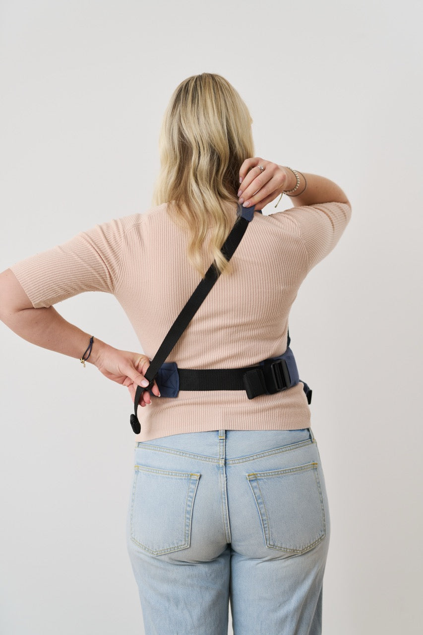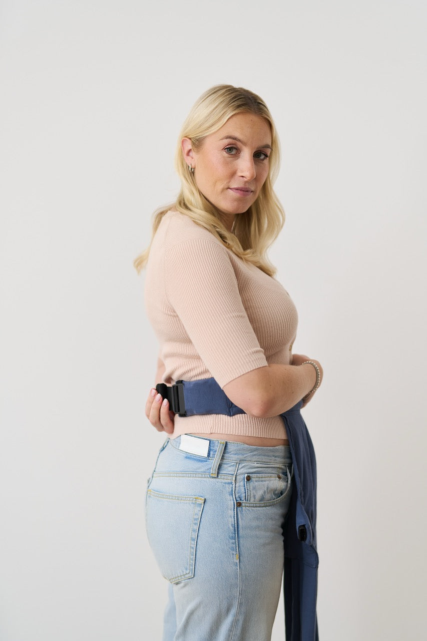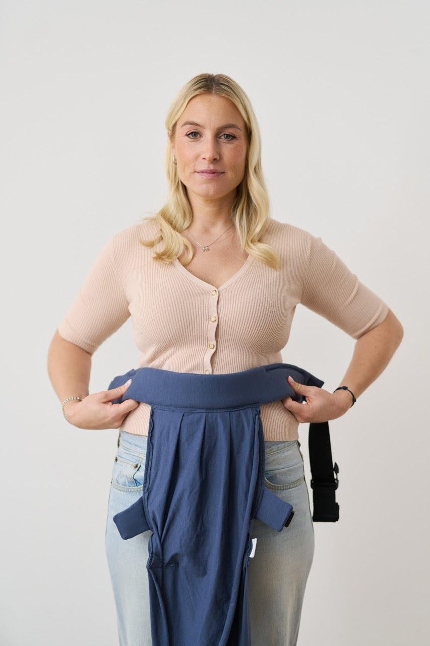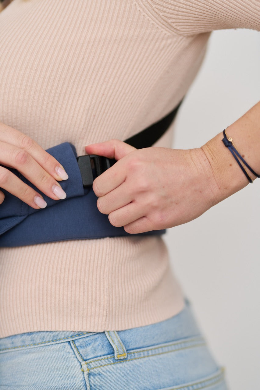 Achte beim Anlegen des Hüftgurtes darauf, dass die Trage insgesamt mittig (d.h. nicht nach rechts/links verschoben) und lieber etwas zu hoch also zu tief sitzt.