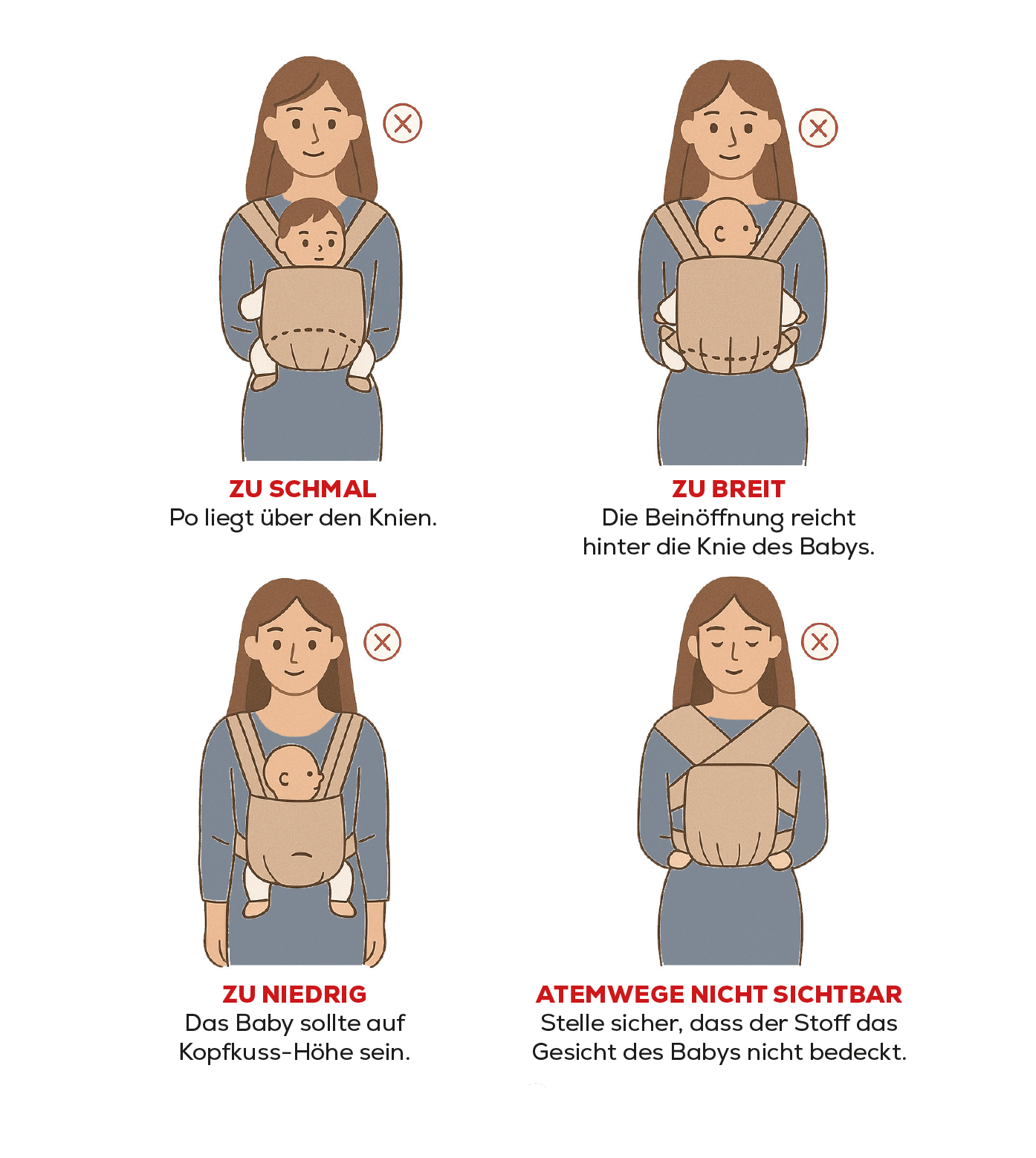 Lies Dir vor der ersten Verwendung die beiliegende Anleitung gut durch. Übe einige Mal das Anlegen ohne Baby, bevor Du Dein Baby reinsetzt. Nimm Dir Zeit und erwarte nicht, dass sofort alles perfekt klappt. Auch das Tragen muss man etwas üben und dein Baby muss sich etwas daran gewöhnen.